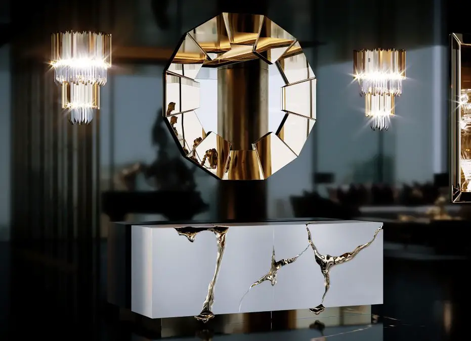 Junto com o aparador Lapiaz e o Lustre Empire, nesta área destacam-se os candeeiros de parede Empire e o requinte do Darian Gold, que não é só um espelho, mas também um obra de arte.