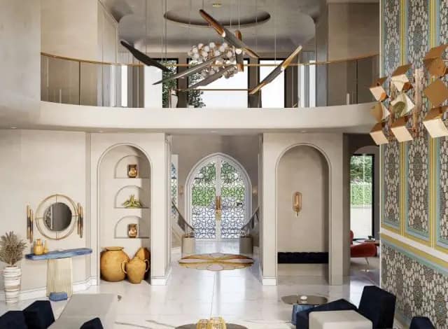 A classe alta da Arábia Saudita preza muito a sua cultura e exibe-a através do esplendor, do luxo e dos dourados, o que se demonstra na imponência e dimensão desta casa, com os seus tetos altos, entrada majestosa, padrões nas paredes e mobiliário de grande requinte.