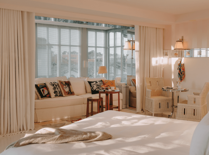 Por detrás da sua arquitetura neo‑século XIX, a Villa Colette revela um universo fértil e refinado, desenhado como uma casa alegre e sensorial. Vinte e oito quartos e suites abrem-se à paisagem — jardins privados, varandas sobre a baía, o sussurro dos pinheiros — num ambiente de tons rosados, madeiras quentes e fotografias surrealistas que criam a impressão de flutuar entre sonho e realidade.